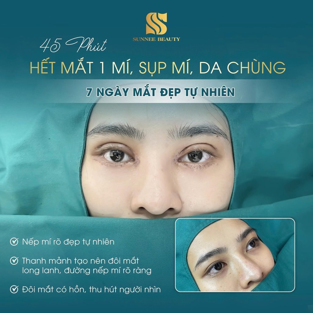 Bạn đã quá mệt mỏi với đôi mắt một mí thiếu sức sống, mắt sụp hay da chùng làm giảm đi vẻ rạng rỡ? Đã đến lúc tạm biệt những khuyết điểm này chỉ trong chớp mắt! SUNNEE BEAUTY mang đến giải pháp thẩm mỹ mắt nhanh chóng, an toàn: chỉ 45 PHÚT để kiến tạo ĐÔI MẮT 2 MÍ HOÀN HẢO, và 7 NGÀY MẮT ĐẸP TỰ NHIÊN! Đây là dịch vụ lý tưởng cho những ai bận rộn nhưng vẫn khao khát sở hữu đôi mắt to tròn, cuốn hút.