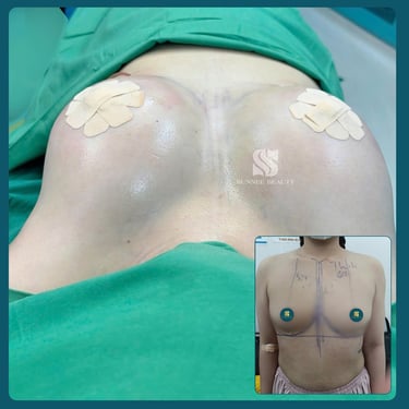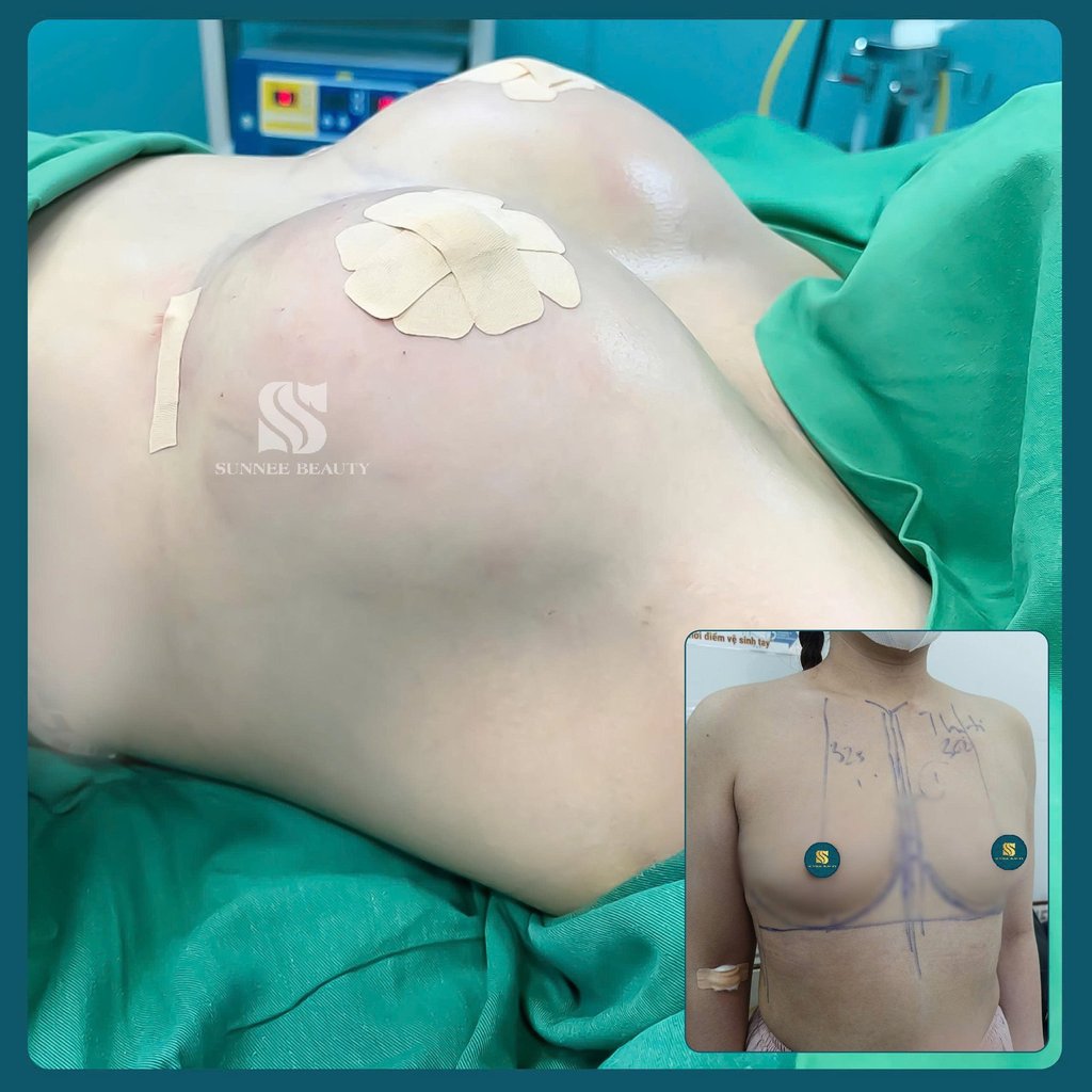 Đo Vẽ Chính Xác: Bác sĩ chuyên khoa thực hiện đo đạc và định vị tỉ mỉ (như hình ảnh trước mổ với các đường vẽ kỹ thuật), tính toán chính xác size túi và vị trí đặt túi, đảm bảo khe ngực gợi cảm và bầu ngực cân đối.