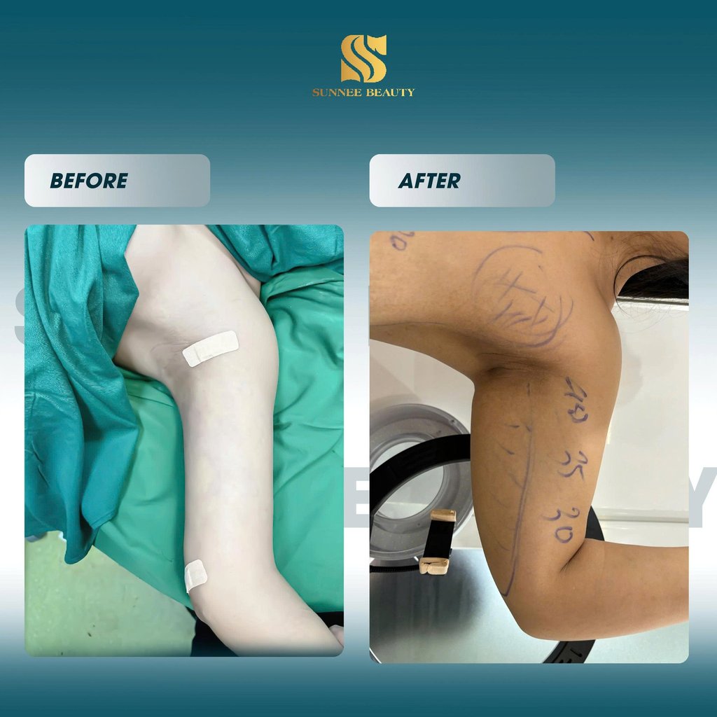 Từ Cánh Tay Thô Kệch Đến Thanh Mảnh: Kỹ thuật hút mỡ hiện đại loại bỏ triệt để mỡ thừa tích tụ, giải quyết tình trạng bắp tay to, chảy xệ (như hình ảnh Before & After với các đường đo đạc và định vị trước mổ).