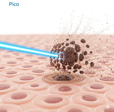 Laser Pico (Pico giây): Hoạt động dựa trên hiệu ứng quang cơ. Xung laser siêu ngắn tạo ra một áp lực cơ học cực lớn, giống như một sóng xung kích, "nghiền nát" các hạt sắc tố thành những mảnh siêu nhỏ li ti như bụi.