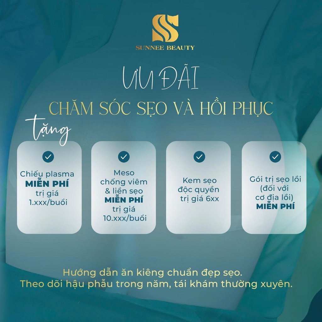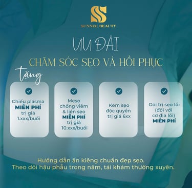Chúng tôi hiểu rằng chăm sóc hậu phẫu là chìa khóa để hoàn thiện vẻ đẹp. Vì vậy, SUNNEE BEAUTY dành tặng gói ƯU ĐÃI CHĂM SÓC SẸO VÀ HỒI PHỤC độc quyền: