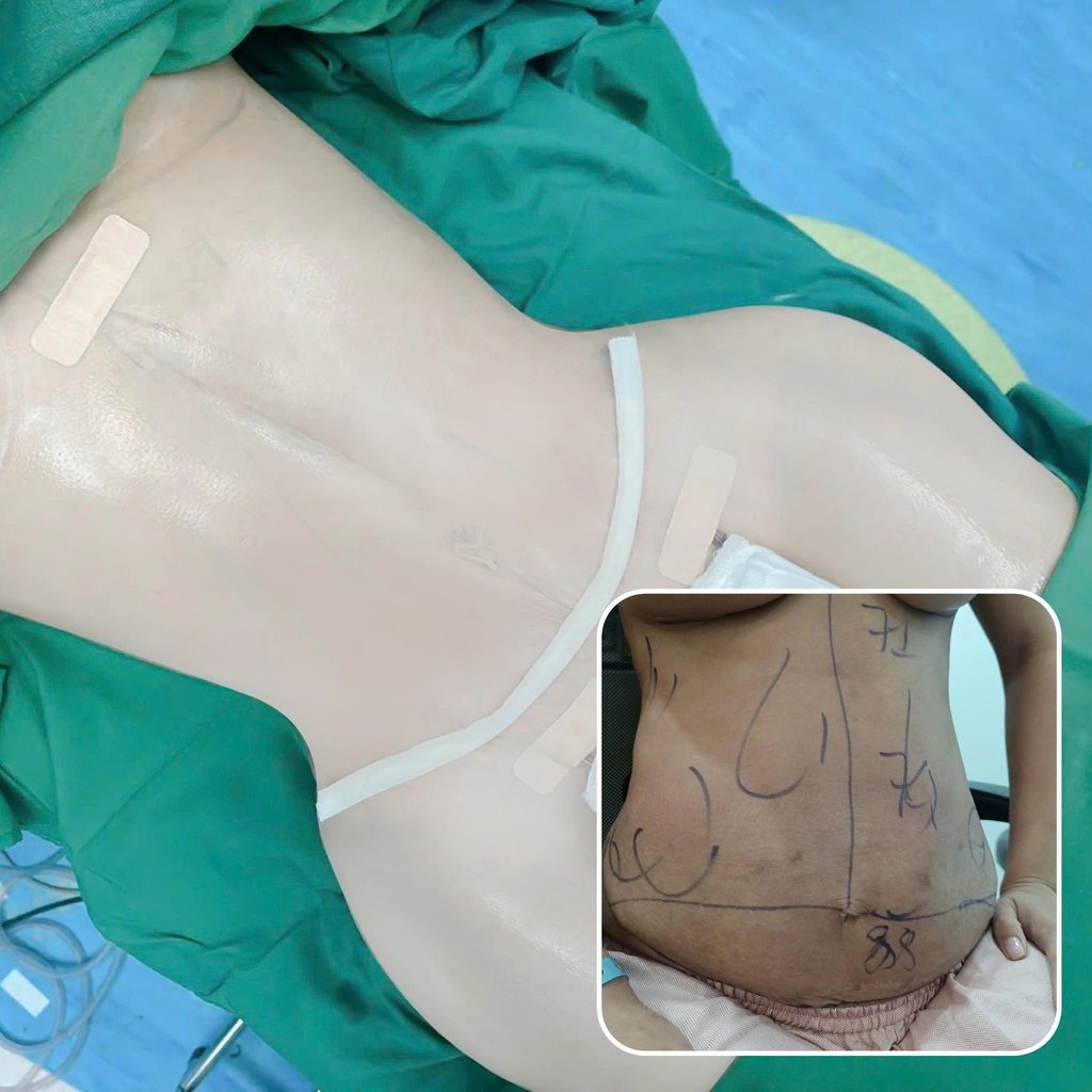 Thực hiện: Vết mổ được bảo vệ cẩn thận bằng băng dán y tế (như trong hình), khách hàng được hướng dẫn mặc áo định hình 24/24 để cố định form.