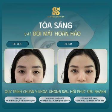 Đôi mắt là trung tâm của sự thu hút. Nếu bạn đang tự ti vì mắt một mí, mí lót, mắt sụp, hay mí bị lệch, đã đến lúc để đôi mắt bạn được "TỎA SÁNG VỚI ĐÔI MẮT HOÀN HẢO" tại SUNNEE BEAUTY. Chúng tôi cam kết mang lại đôi mắt trẻ trung, cuốn hút, tự nhiên hoàn hảo với quy trình thẩm mỹ chuẩn mực. Sự thay đổi về đôi mắt sẽ làm bừng sáng cả gương mặt, giúp bạn tự tin hơn rất nhiều (như hình ảnh Before & After minh chứng sự cải thiện rõ rệt).