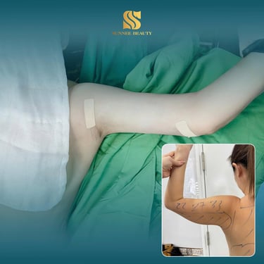 Giải pháp: Hút mỡ điêu khắc chính xác vùng bắp tay, đùi, tạo dáng thon gọn, nuột nà (như hình ảnh trước và sau phẫu thuật bắp tay).